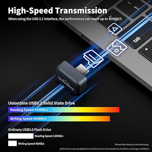 High Speed Transfer: UnionSine USB SSD with USB 3.2 interface and read speeds of up to 450 MB/s, which is up to 9 times faster than conventional USB 3.0 memory sticks. Allows you to quickly move high-resolution photos, videos and large files