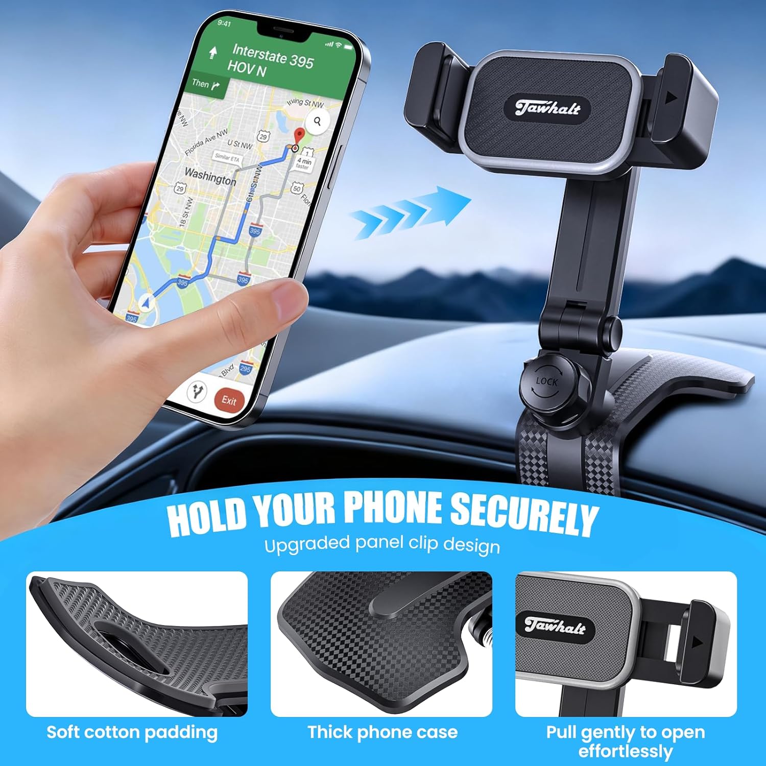 Universal Dashboard Cell Phone Holder Mount with 360° Rotation Multifunctional Clip on Phone Holder for Car Compatible with All 4-7.2 Inch Smartphones