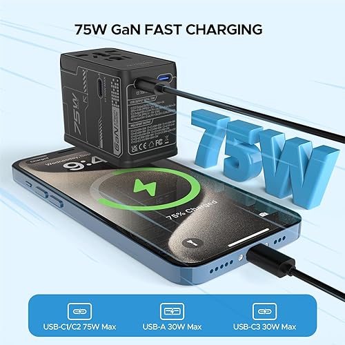 5-in-1 International Power Adapter: Equipped with 4 USB ports (3 USB-C and 1 USB-A) and a universal AC socket, this adapter supports US, EU, UK, and AU plugs (excluding India and South Africa), allowing you to connect electronics from various countries. It can charge multiple devices simultaneously, making it ideal for iPhones, Samsung and other Android phones, smartwatches, tablets, power banks, cameras, handheld gaming consoles, earphones, and other USB-powered devices. Total USB output of 75W.