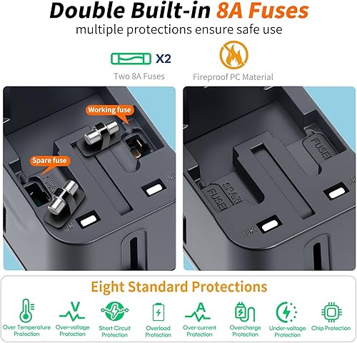 【Spare 8A Fuse Safe Reliable】Built in double fuses, one in use and the other for spare, effectively prevent overcharging and short circuit, with FCC, CE and RoHS certified. Safety shutters, flame retardant material and plug lock system provide more secure charging.