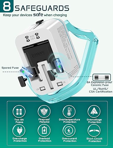 Universal Adapter for Travel: With 4 types of plugs, the travel adapter works in 200+ countries and regions. Type C: France, Germany, Italy, Spain and most of Europe; Type G: Dubai, England, Ireland, India, HK, etc; Type I: Australia, China, New Zealand, etc; Type A: USA, Canada, Japan, etc. Forget carrying multi plug adapters – all you need is one TECSIX all-in-one travel adapter!