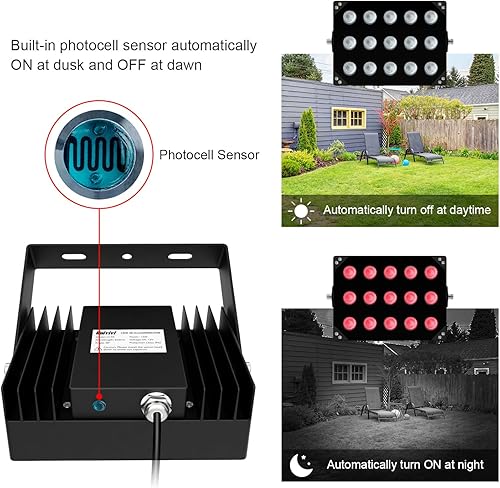 ✅【AUTO ON and OFF】-Infrared light for camera built-in with photocell sensor, the IR illuminators auto switch on at dusk and switch off at dawn, energy saving and secure long lifespan. Wave length 850nm Infrared light, the beam light is INVISIBLE to naked eyes but give a red glow.