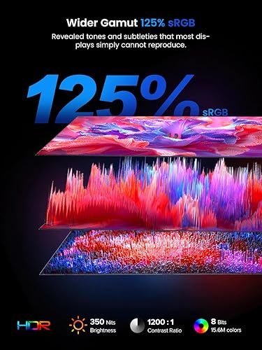 【125%sRGB for Vivid Visuals】Exceptional color accuracy and clarity. Portable laptop monitor features a 125% sRGB wide color gamut and Full HD resolution, bringing every hue to life with vivid realism. Combined with HDR technology and 350nits brightness, it delivers detailed, true-to-life imagery—perfect for immersive entertainment, creative work, or business work.