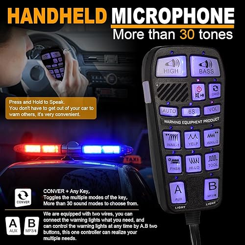 EXTRA CONVENIENCE -- This warning system can also broadcast via microphone mode. All-in-one handheld control ler and microphone, easier to operate with one hand while driving. Furthermore, Equipped with two additional power switches (A/B) to power your traffic emergency warning lights or other equipment without the need for a second switch box. This versatility ensures you can easily power up and tackle any situation.
