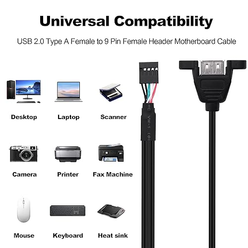 USB 2.0 header splitter extension cable expand USB 2.0 9 Pin header into two USB 2.0 type A female ports to let 2 devices simultaneously, works perfectly for keyboard,mouse,desktop,laptop,printer,scanner,fax machine,camera,heat sink and other devices.