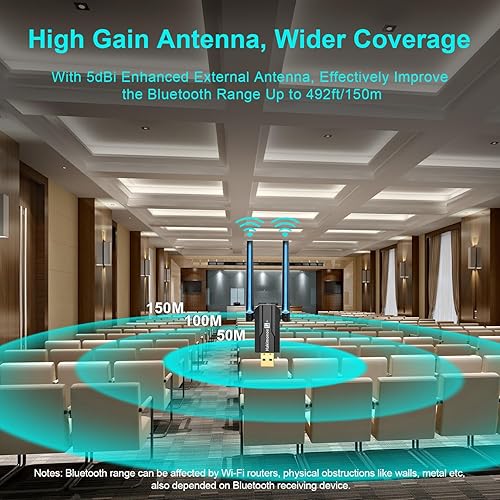 【EXTEND LONG RANGE】Utilizing Class 1 Bluetooth technology and designed with dual antennas, BT11 Bluetooth transmitter receiver adapter can achieve a range of up to 492ft (150m) line-of-sight in open air and up to 164-328ft (50-100m) indoors. *NOTE: Operation range can be affected by Wi-Fi routers, Wireless TV adapters, physical obstructions like walls, metal obstacles etc. and also depended on Bluetooth receiving device.