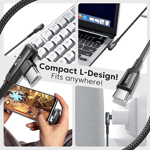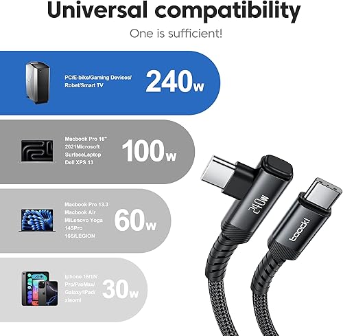 Universal Compatibility for All USB-C Devices: Designed for seamless integration, our cable supports a wide range of devices requiring 60W–240W power, including iPhone (16 Pro/Max), Samsung Galaxy S20–S24, MacBooks (Pro/Air), iPads (Air/Pro), and more. Its versatile 90° right-angle design ensures effortless connectivity without tangling, while maintaining optimal charge efficiency. Perfect for gaming, video streaming, or daily use—this cable adapts to every need