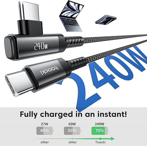 Unmatched 240W Ultra-Fast Charging: Experience fast charging with our 240W USB-C to USB-C right angle cable, leveraging the latest PD3.1/QC4.0 technology. Super fast charging your MacBook Pro to 75%, Galaxy S24 to 85% and iPhone 16 from 0% to 65% in 30 minutes. This cable delivers up to 480Mbps data transfer speeds (1,200 songs synced per minute). Note: This is a USB 2.0 cable; USB 3.0/3.1/4.0 ports are not supported