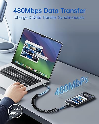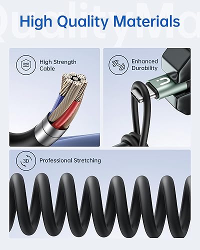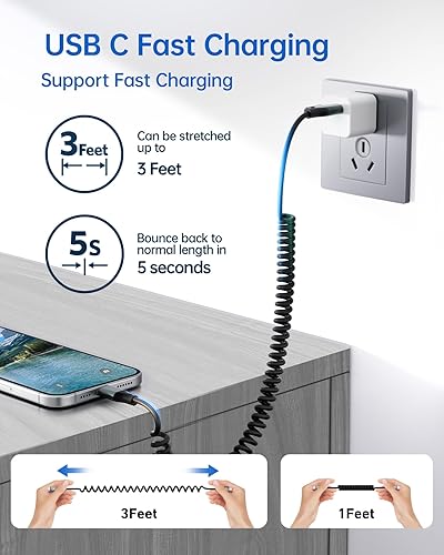 【iPhone 17/16/15 USB A to USB C Cables】 The coiled usbc charger cable natural length is 1.3 feet, stretchable to 2-3 feet(comfortable length), up to 4 feet. As a shorter expanded cord, its compact ability is more organized than a single straight cord.