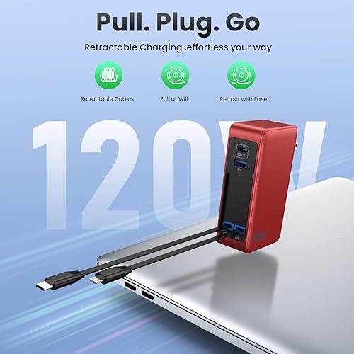 【High-Efficiency 120W GaN Charger】 Featuring advanced Gallium Nitride (GaN) technology, this retractable charger has a high energy conversion rate of 92%, ensuring faster, more stable charging with less heat compared to traditional chargers.