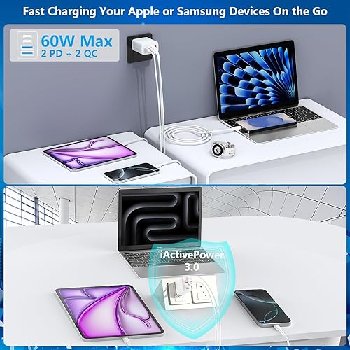 【Integrated Superconductor Material】: LANWK's 4-Port 60W Dual USB-C&USB-A Wall Chargers Adapter Built In Smart-IC Chip can auto-detect iPhone connected in each port while also identifying the appropriate current to charge your device. Adopt integrated superconductor material which engineered for reduced resistance, boosting charging efficiency ensureing safer charging and protecting your iPhone battery health.