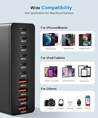 10 PORT CHARGING STATION:10 in 1 Charging blocks with 6x USB-C PD 3.0 port (20W max), 4 x USB-A port(20W max), this charger supports a maximum output of 200 watt in total. No need to wait, it can charge your watch, earphone, mobile phone, fan and other 10 different devices at the same time.