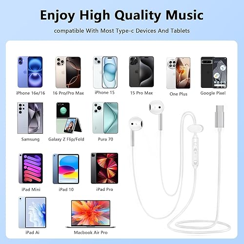 【Broad Compatibility】:USB c headphone wired ear buds for iPhone 17 Pro Max/16 Pro Max/16e/16 Plus/16 Pro/15/15 Plus/15 Pro/15 Pro Max/Samsung Galaxy S25 Ultra/S25 Edge/S24 Ultra/S24 FE/S24+/S24,S23 FE/S23 Ultra/S23+/S23,S22 S21 S20 Ultra FE,Note 20 Ultra/20,A17/A16/A15/A35/A55/A54/A53,Tablet A9+, Z Flip 7/6/5/4/3/Z Fold 7/6/5/4/3/2; for iPad Pro(M4), iPad 10,12.9'' iPad Pro 6th/5th/4th/3rd gen,11'' iPad Pro 4th/3rd/2nd gen, iPad Air M2/5th/4th, iPad mini 6th, Macbook Air Pro; Google Pixel 10 Pro XL 9 8 8a 8 Pro 7 7a 7 Pro 6 Pro 6a 6 5 4 4XL 3XL; OnePlus 10T 10 Pro 9 8 Pro and more USB-C device.