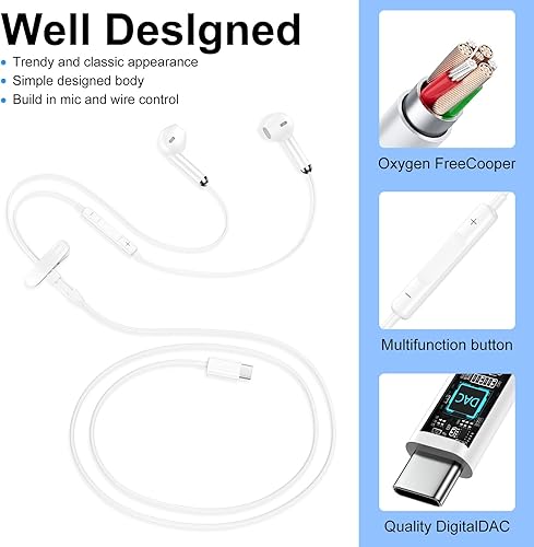 Earphones Wired Wide Compatibility: usb c iphone 16 ear buds pods wired for iPhone 16 Pro Max/16 Plus/16/16 Pro/,iPhone 15/15 Pro/15 Pro Max/15 Plus , iPad Pro 12.9 /11,iPad Air,iPad Mini; Samsung Galaxy earbuds Compatible for Samsung Galaxy S25 Ultra S25 S24 FE S24 Ultra S24 S24+ S23 FE S22 S21 S20 S10 S9,A16 5G A15 A55 A35 A25,A14 A9 A13 A54 5G,A53,A03s,A24,A23,Z Fold 6 5 4 3,Z Flip 6 5 43 ,Note 20 10 9; Google Pixel 9 Pro,9,9 Pro XL,9 Pro Fold,8a,8 Pro,8,7a,7 6 Pro,6a; Moto RAZR/ G 5G /Edge/LG/ One Plus/ usbc earbuds compatible for more USB C devices.