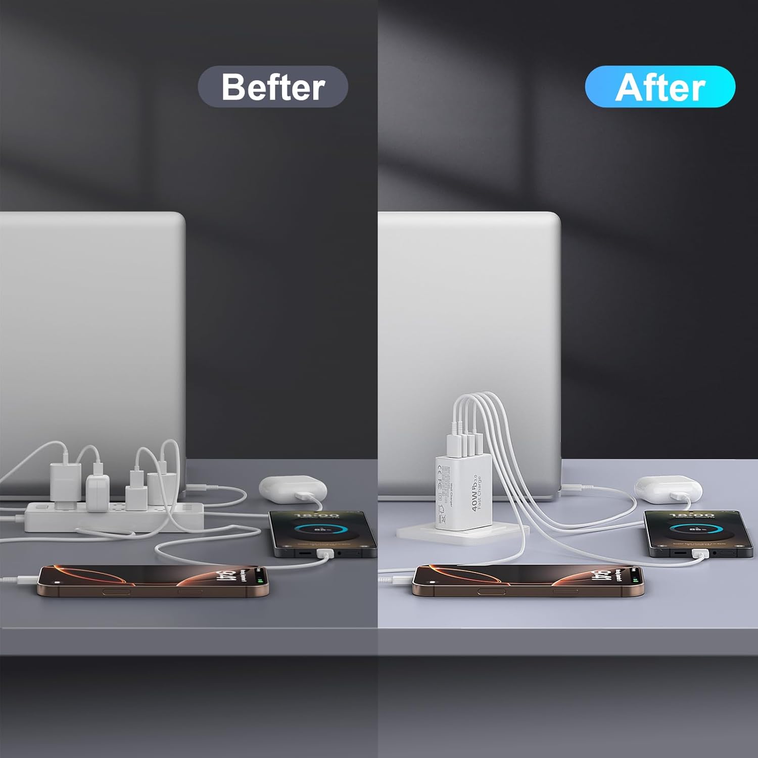 USB Multiport Charger Block -- A 6 IN 1 Upgraded USB C Power Block with triple USB-C ports and triple USB-A ports. It allows users to charge up to 6 devices simultaneously, while its incredibly compact size and high efficiency minimize waiting time. This design lets users conveniently charge phones, tablets, cameras, power banks, and various devices all at once, Ideal for home, office and on the go.