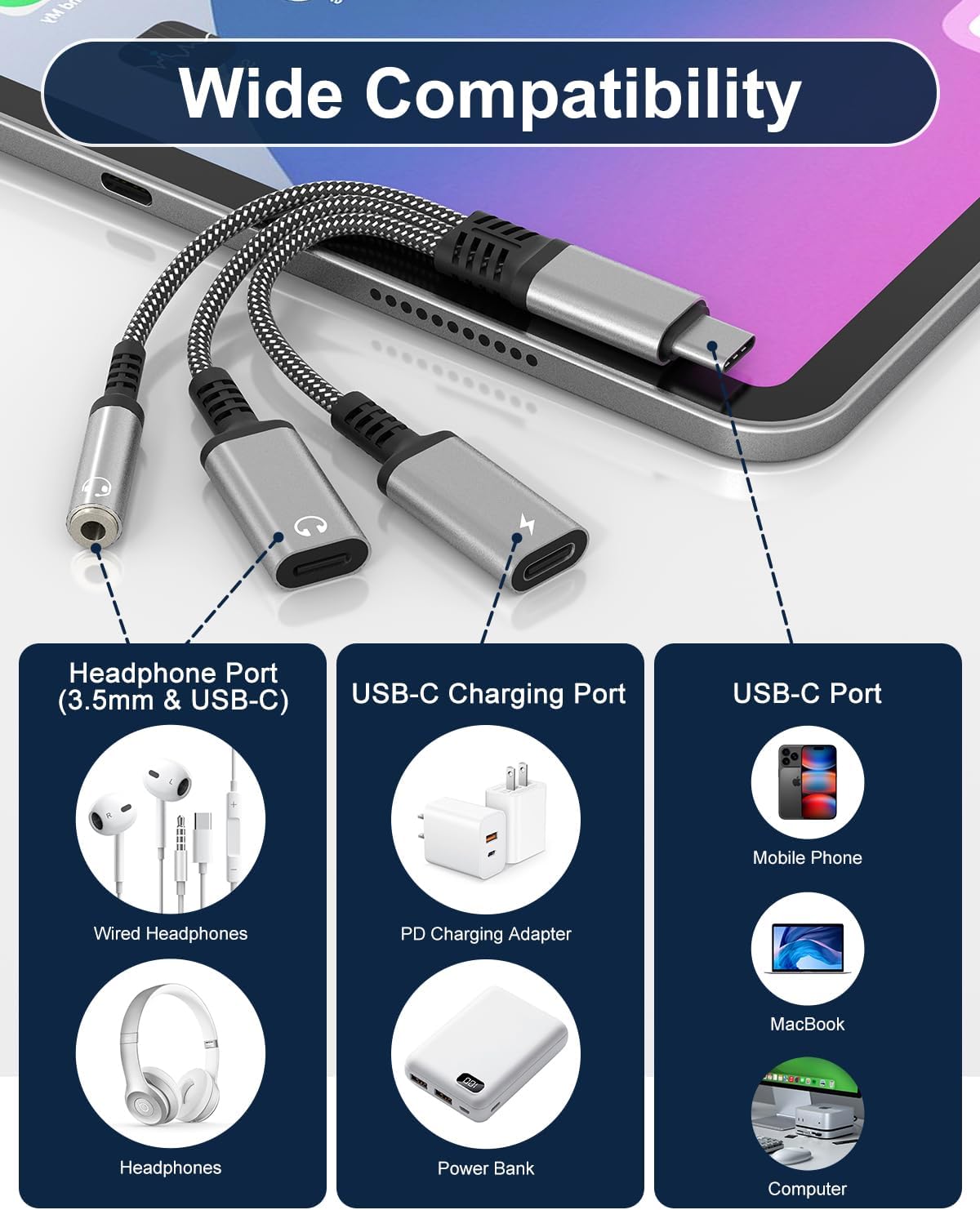 3-in-1 USB C Audio Splitter: Multi-functional USB-C adapter with 3 ports: 3.5mm headphone jack, USB C audio, and USB C PD fast charging, allowing you to enjoy music, make calls easily, and charge your device at the same time, with ultra-high efficiency in multitasking. Perfect for USB-C devices lacking a 3.5mm headphone jack.