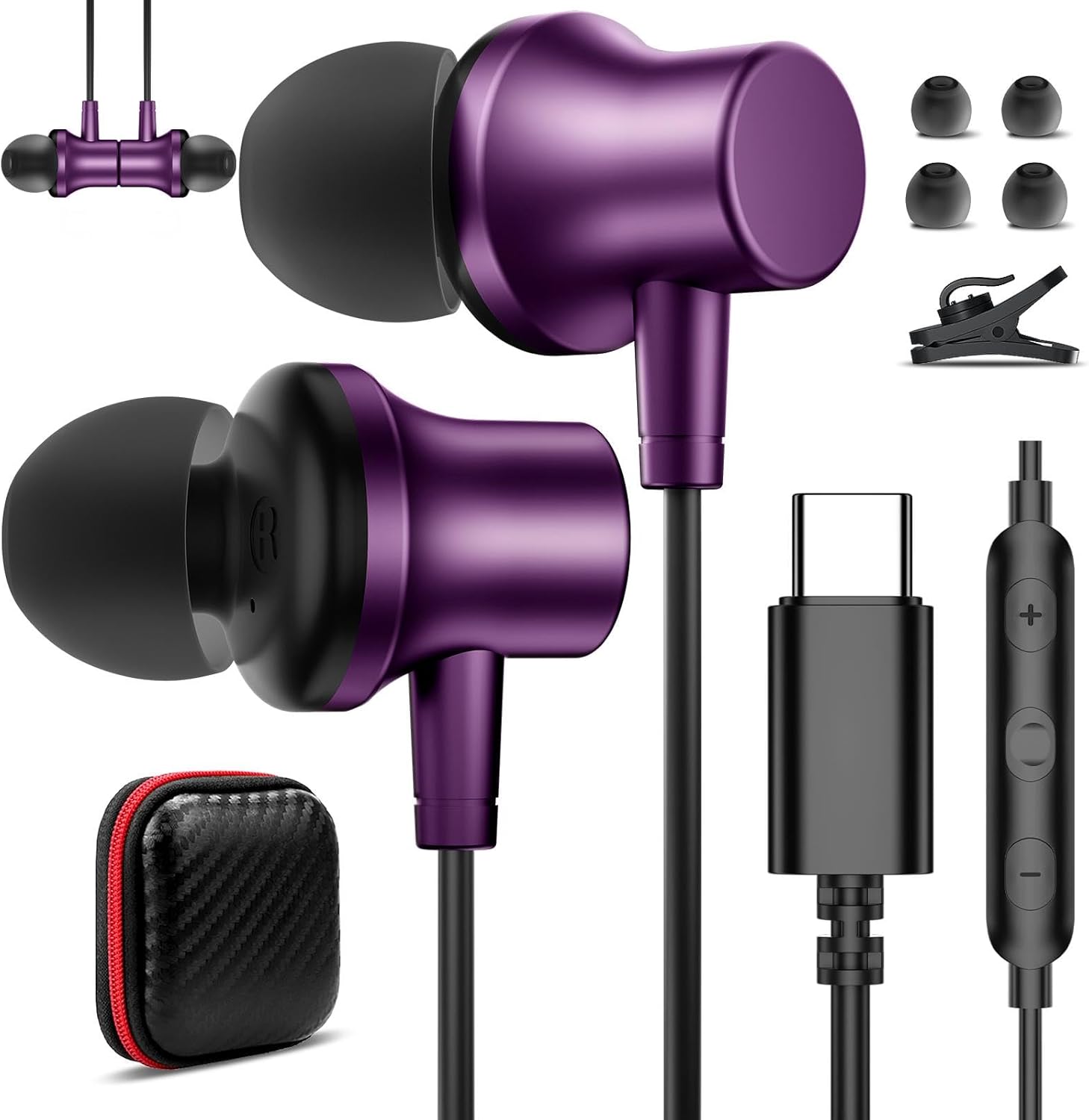 Tangle Free Magnetic USB C Earbuds: Metallic Casing with Matte Finishing and Classic Colors Ensures Unique Stylish Looking, Built-in Magnets Allow You to Tab Then Ear Buds Around Neck for Convenient Wearing to Avoid Wire Tangling