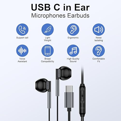 【What You Get】1-Pack Samsung Wired Earphones iPhone 16 Headphones USB C Wired Earbuds. Multi-function control buttons support phone Listen, Hang Up/Refuse, Volume + -, Play/Pause, Next/Previous. Even when walking on noisy streets, the built-in HD microphone headphones can provide clear human voice and isolated background noise, so you won't miss family's greetings or company work arrangements. If you are not satisfied with our wired earbuds usb c earphones, please feel free to contact us.