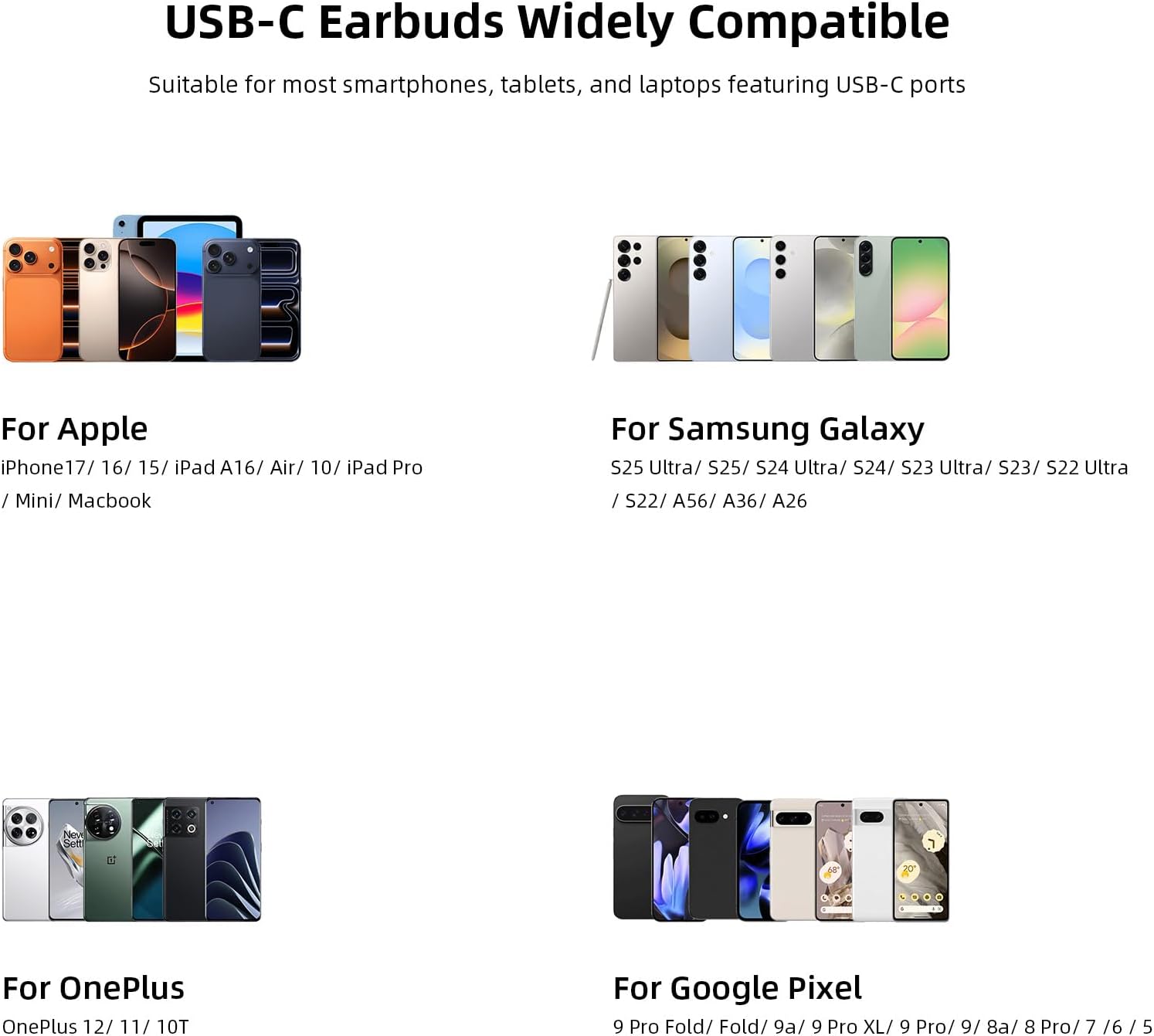 Compatible Devices: Works with most USB-C enabled smartphones, tablets, laptops, and otherelectronic devices. Type C earphones for iPhone 17, 17 Air, 17 Pro, 17 Pro Max, 16, 16 Plus, 16 Pro, 16 Pro Max, 15, 15 Plus, 15 Pro, 15 Pro Max, for Xiaomi 15 Ultra, 15, 14T Pro, 14, 13T Pro, 13 Ultra, for Galaxy S25 Ultra, S25, S24 Ultra, S24, S24+, S23, S22, S21 FE, S21, S21 Ultra, S20 FE, S20, S20 Ultra, for Galaxy Z fold, A53, A33, for Galaxy Tab S10 Ultra, for Galaxy Tab S9 FE+, for Google Pixel 9 Pro Fold, 9a, 8a, 8 Pro, 8, 7a, 7 Pro,6, 6 Pro, 5, for iPad Pro 2020 2021, for iPad Air 4th 2022, for iPad Mini 6 and more