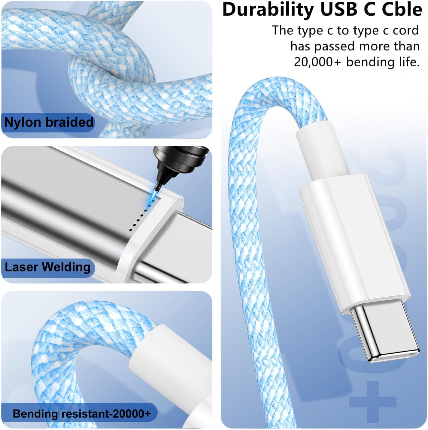 【Durability & High-quality USB C Cable】We use high-quality materials to design and manufacture, and each type c to type c cord has passed more than 20000+ bending life and strong bearing capacity tests, which is sturdy and durable without winding.