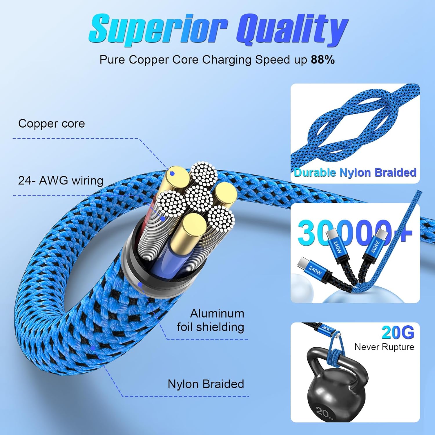 【240W Fast USB C to USB C Cable】: The 240W USB C to USB C Cable is also compatible with 140W/ 100W/ 65W/ 60W/ 45W/ 20W, just make sure the plug using is appropriate, this type c charger fast charging 10ft offers the fastest charging speed,super fast charging your MacBook Pro 14"/16"(M4) to 88% in 35mins. 240w usb c to usb c fast charging cable supports samsung galaxy s25 ultra 45w super fast charge 2.0 (0–95% in 35 mins) and iphone 16 45w high-speed charging (0–93% in 35 mins). The type c cable can meet the demands of fast charging in the next 5-10 years.