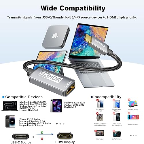 【Wide compatibility】Specifically designed for Type-C ports (Thunderbolt 3/4) with video output capability (HDMI Alt Mode). Compatible with iPhone 15/16 series, MacBook Pro 2016-2023, MacBook Air 2018-2023, Mac Mini 2018-2023, iPad Pro 2018-2023, iPad Air 2020-2022, Dell XPS 17/15/13, Surface Book 3, Surface Laptop Go, Surface Laptop 3, Surface Pro 7, Galaxy S23/S22/S21, and more. Supports mainstream operating systems including Windows, Android, ChromeOS, and macOS