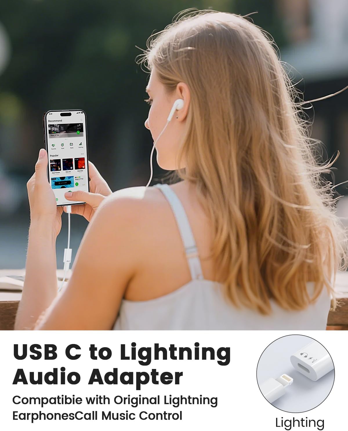 Stable Sound with Advanced DAC Audio Chip:Built with an integrated DAC chip, this lightning to usb c adapter audio ensures stable, clear sound for music, calls, and videos. Use it as a usb audio adapter, headphone to lightning adapter, or headphone to usb c adapter for smooth and consistent listening