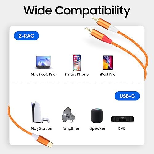 ❤【Excellent Sound Quality】: Built-in audio decoder chip brings better sound quality and compatibility,The USB C to 2RCA DAC Cable lets you enjoy no-loss, noise-free, high-fidelity audio on home Hi-Fi system, car stereo radio, soundbar, turntable, speaker, mixer, amplifier