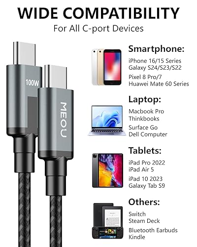 Broad Compatibility: MEOU type c charging cable supports most of the fast charging protocols on the market. It can charge all USB-C phones, tablets, laptops, such as iPhone 16 15 Series, Apple Macbook, Samsung, iPad, Camera(with USB C interface) etc at maximum speed
