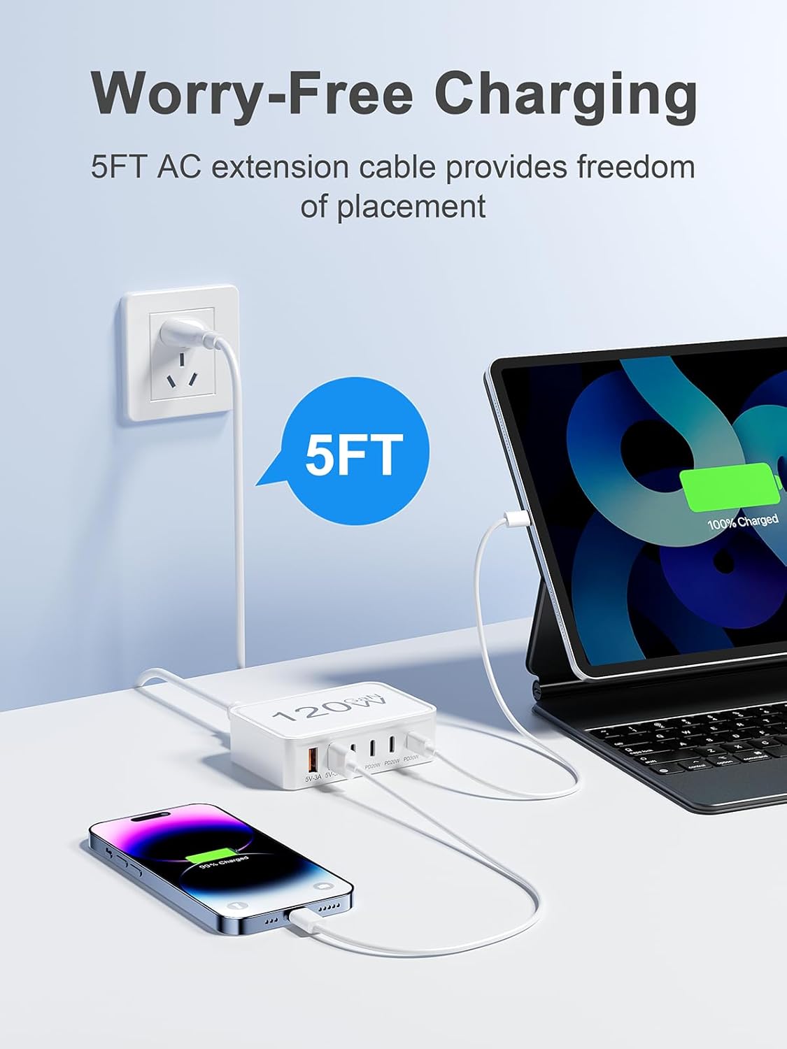 【120W Powerful USB Charging Station】Only 30 minutes, charge your phone to 60%. 6 in 1 Charging blocks with 4 x USB C PD port, 2 x USB A port, this charger supports a maximum output of 120 watt in total. No need to wait, it can charge your watch, earphone, mobile phone, fan and other 6 different devices at the same time