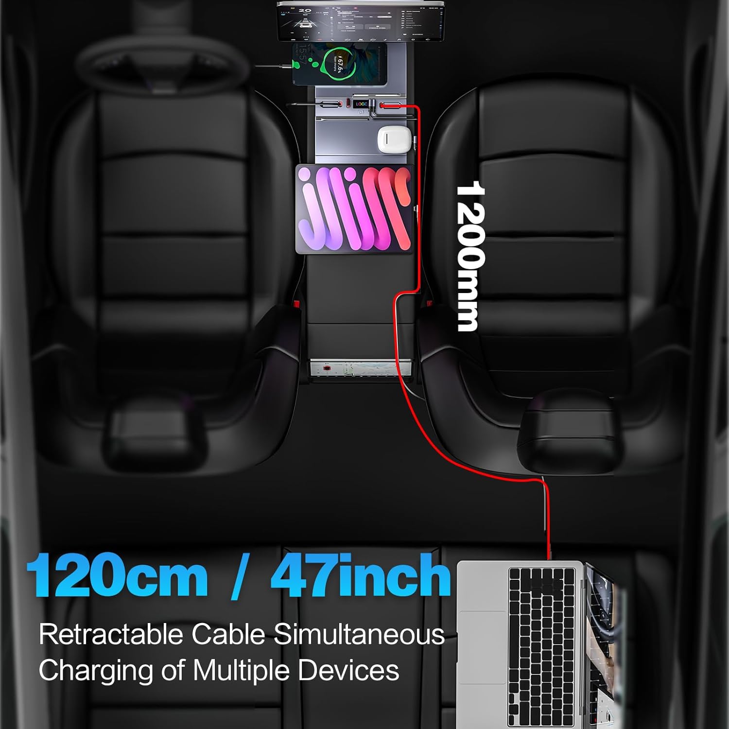 【47 inch Dual Retractable Cable】This Tesla car charger hub features an ingenious tangle-free retractable cable design that includes a PD 45W USB C and a lightning retractable cable, making it easy to charge Apple and Android devices without additional cords. The retractable cable extends up to 47 in and retracts automatically when not in use. Keeps the interior of your car tidy and organized.