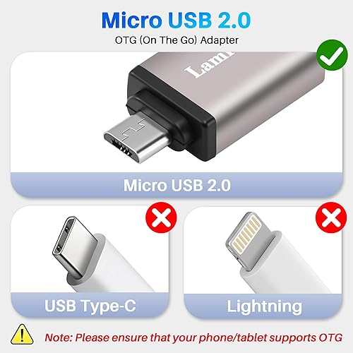 Portable and Versatile: Micro USB 2.0 OTG adapter provides a simple way to view images, listen to music, convert data from flash drives, and edit files with the mouse. Plug and Play, no drivers needed. Powered by Micro USB port, no external power supply required. (Note: please make sure that your phone/tablet supports OTG).