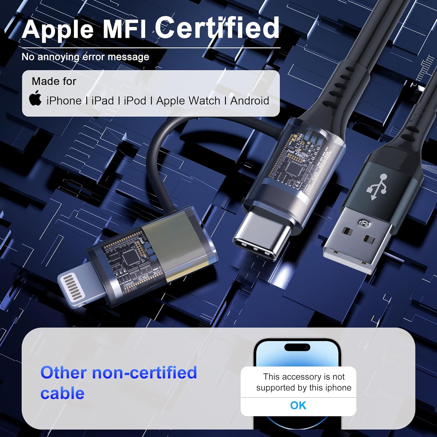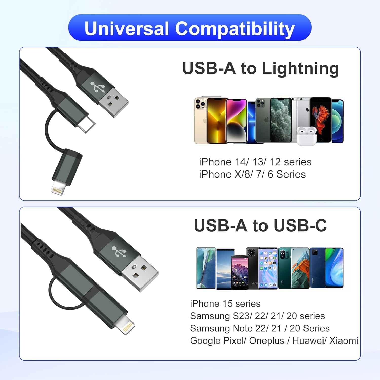 2-in-1: 2-in-1 Multiple charging cable was designed with the idea of simplifying your life. It combines 2 ports (USB A to USB C, USB A to Lightning) in one cable. Each port supports charging and data transfer functions. One cable equal TWO cables. No need to carry multi cable for different devices.