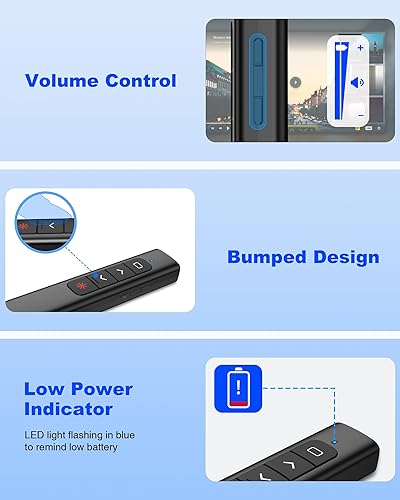 【Multifunctional Wireless Presentation Clicker】This slide clicker supports page up/down, full screen/black screen, volume control (+/-), window switching, and hyperlink activation – all with 4 intuitive buttons. Perfect for PowerPoint, Keynote, Prezi, and even Excel/Word demos – toggle between slides, dim the screen for focus, or adjust video volume mid-presentation without returning to your desk