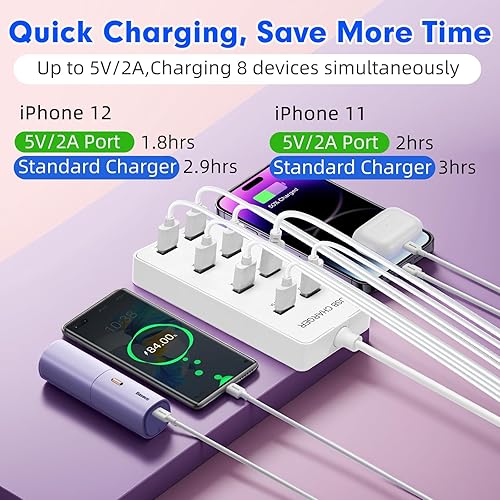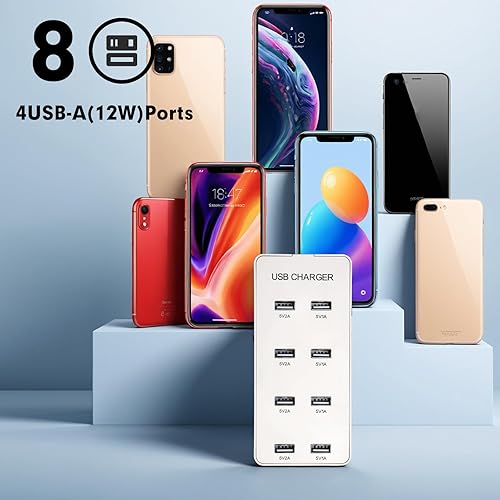 【8-Port 60W High-Efficiency Charging Station】Say goodbye to outlet hogging! This 8 port USB charger delivers a robust 60W total output, efficiently powering up to 8 devices simultaneously. It's the ultimate desktop charging station for power users with smartphones, tablets, smartwatches, and more, eliminating the clutter of multiple USB chargers on your desk or nightstand