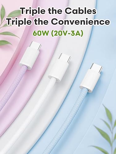 3-Pack Multi-Color Design: Express your personal style with three premium USB-C to USB-C cables in white, blue, and purple. Perfect for home, office, and travel use while keeping your devices organized and easily identifiable
