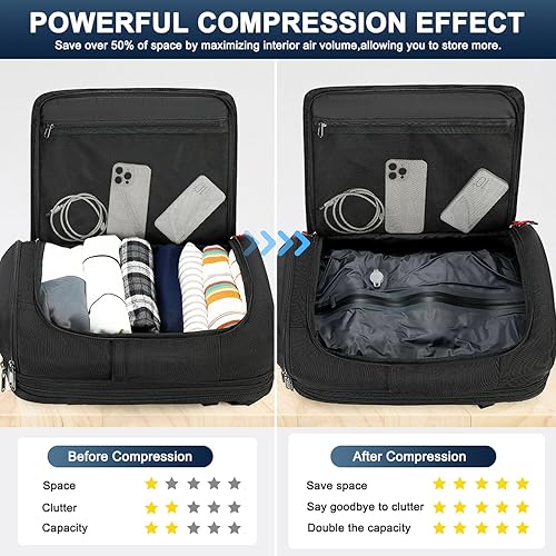 【Vacuum Compression Backpack – Travel Lighter, Pack Smarter】Cut clothing volume by up to 50% with this innovative vacuum compression backpack. Equipped with a built-in vacuum pump, it instantly turns bulky loads into compact packs—ideal for carry-on travel, business trips, hiking, or weekend getaways. Say goodbye to overstuffed luggage and hello to organized, stress-free travel with this vacuum-sealed travel backpack.