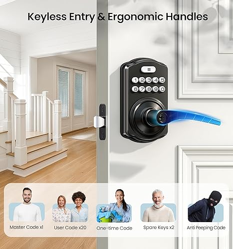 4-in-1 Keyless Entry: The keypad door lock with handle supports 21 user codes, one-time code, an interior thumbturn, 2 spare keys for versatile access. Ideal for front doors, bedrooms, garages, and apartments