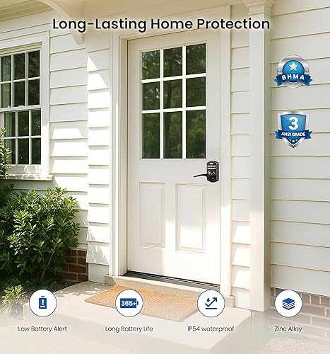 Bank-Level Protection: Built with heavy-duty zinc alloy, an ANSI Grade 3 lock cylinder, IP55-rated protection, and 365-day battery life with low-battery alerts, this keyless entry door lock offers lasting strength and reliable performance year-round