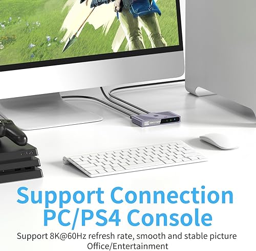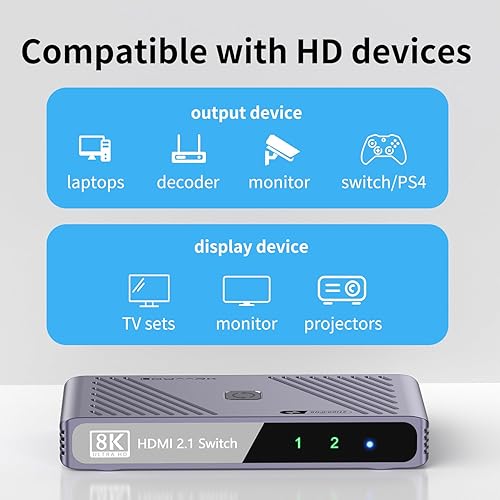 Stable and Fast Transmission: 8K HDMI2.1 switcher supports HDR Chroma, 8K@60Hz, 4K@120Hz and is backward compatible. Provides smoother gaming experience and clearer picture. Using 8K resolution or other high resolutions and high refresh rates requires an HD 2.1 cable to connect the device.