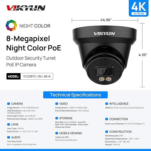 VIKYLIN 4K 8MP Full Color PoE IP Camera, Outdoor 4K PoE Turret Camera with AI Human/Vehicle Detection, 2.8mm Lens,F1.0 Aperture,98ft Color View Night Vision,1-Way Audio,IP67,Blue Iris,NDAA Compliant(Color AI Camera / Black)