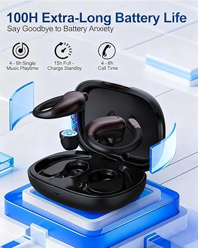 100-Hour Total Battery Life & Fast Type-C Charging: Up to 4–6 hours of continuous play per charge, extended to 100 hours with the charging case. Supports 2–3 recharges via portable case, 15-day standby. Equipped with fast-charging Type-C, full charge in just 1 hour—perfect for workout earbuds on the move