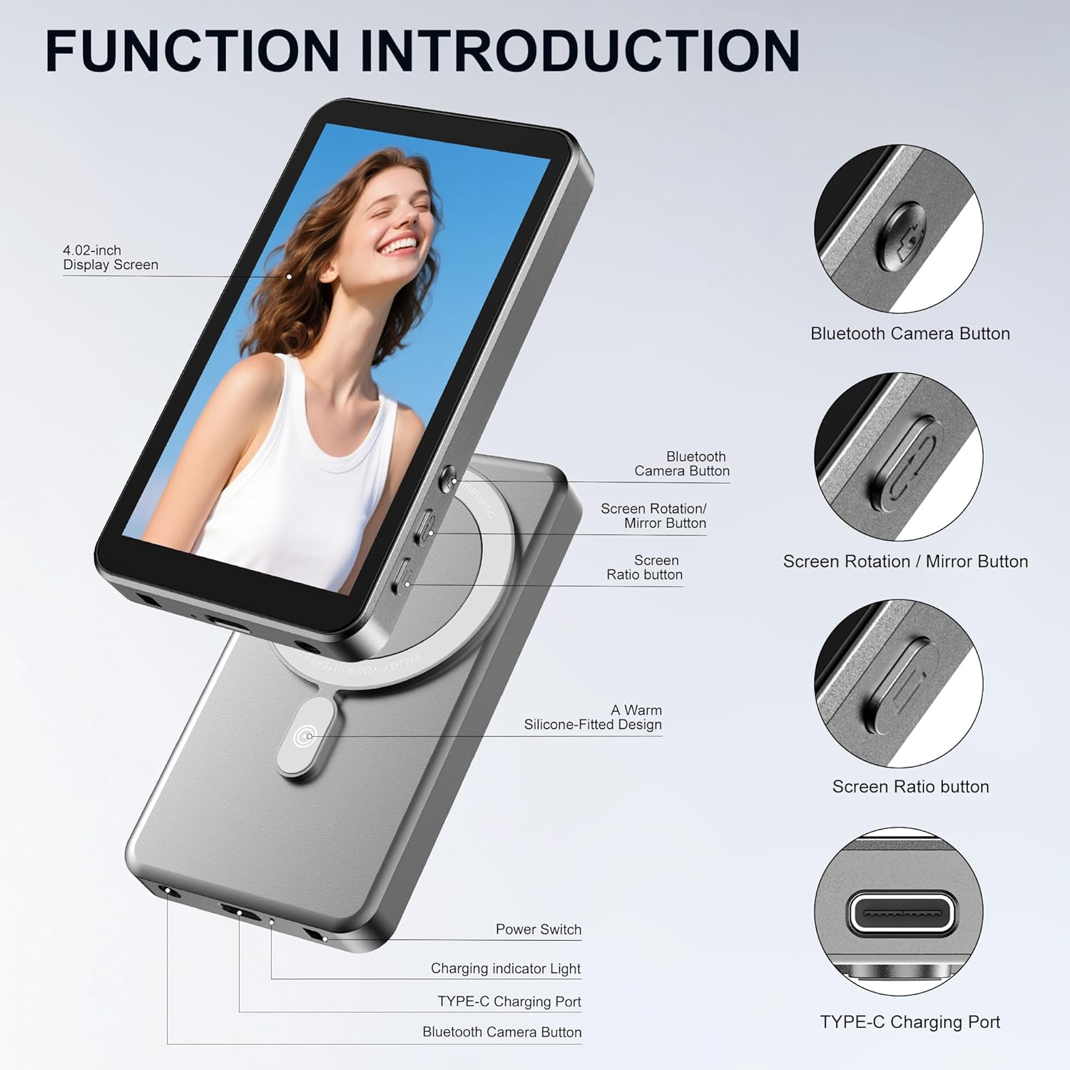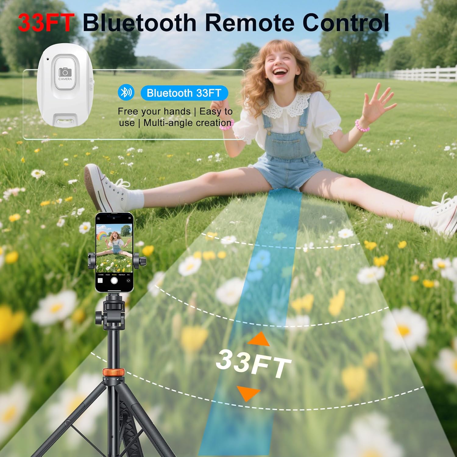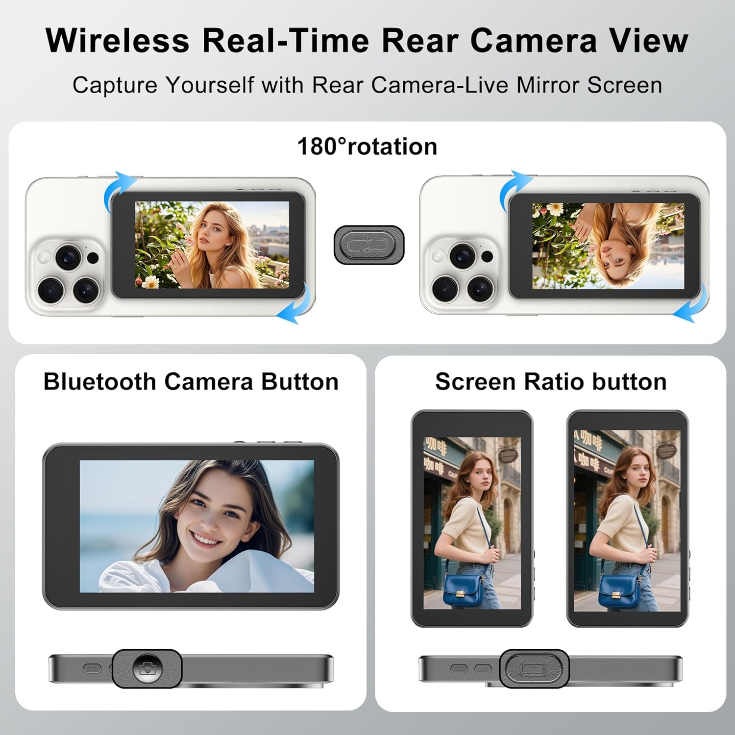 【33ft Bluetooth Remote & Universal Compatibility】Capture the perfect shot from a distance with the included Bluetooth remote, which maintains a stable connection to your smartphone from up to 33 feet away. The remote features a convenient Type-C charging port and can be powered by a power bank, laptop, or adapter. The selfie monitor offers broad compatibility with iOS 9.0+, Android 2.0+, HarmonyOS 3.0+, and MagicOS 4.0+, making it the perfect tool for content creators and vloggers.