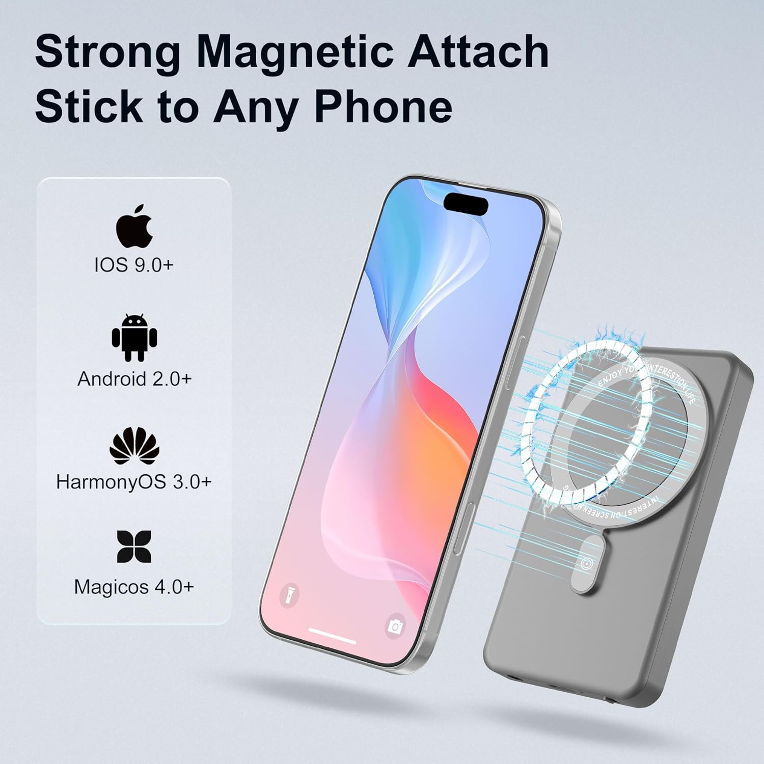 【Wireless Magnetic & Portable Design】This 4 Inch screen features a super-strong magnetic base that locks securely and directly onto iPhone 12-16 models. For other smartphones, simply use the included metal plate for easy attachment. To achieve the best magnetic hold when using a phone case, fix the provided metal ring to the back of your case. A crucial step: Always peel off the adhesive backing from the metal ring first. This ensures your magnetic screen attaches to your phone with maximum stability and security.
