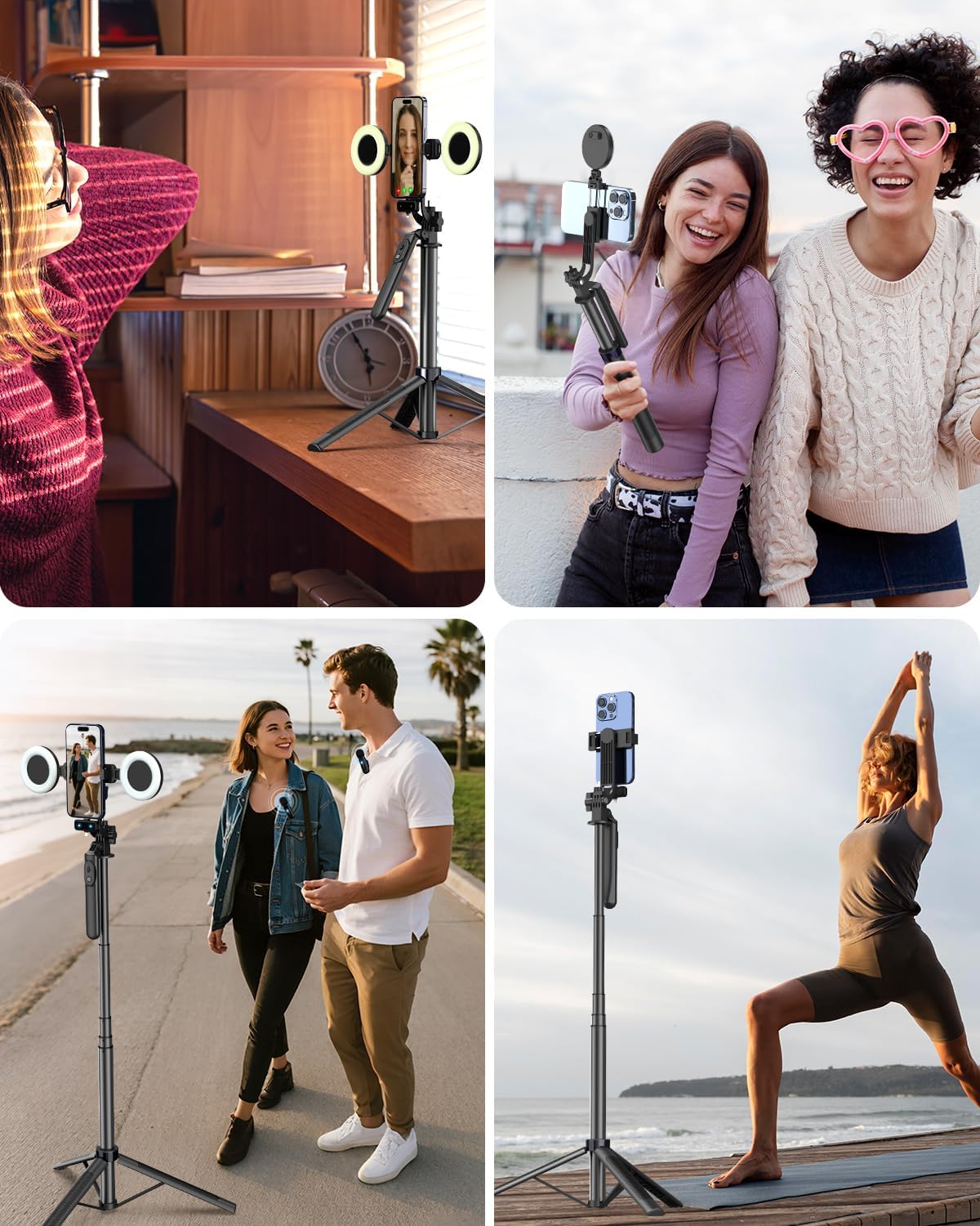 Detachable Fill Lights & Smart Remote: This content creator essential tripod with light features detachable dual LED fill lights, with 3 color modes (Warm/Cool/Natural) and 3 brightness levels to enhance low-light shots. Studio-grade lighting control lets it adapt effortlessly to diverse scenes and moods. Also included is a Bluetooth remote (33ft range) for wireless shutter control, plus Type-C rechargeability for on-the-go use.