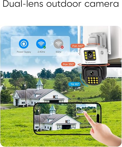 【Two-lens View& AI Auto Tracking】 VSTARCAM security cameras wireless outdoor,Two cameras in one machine,with fixed and rotating cameras,When you click on the screen, the dome screen automatically positions and rotates,and quickly locates and fixes the target.If there is a human figure on the camera image,the automatic tracking will be activated.