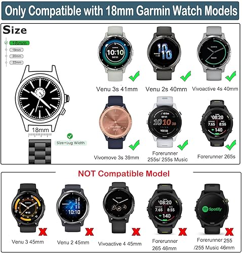 Pecially designed Band for 18mm Garmin Vivoactive 4S 40mm ( 2019 release), Garmin Venu 2s / Venu 3S , Garmin Vivomove 3s , Garmin Forerunner 255s/265S (NOTE: NOT FOR VIVOACTIVE 4 45MM , VENU / VENU 2/ VENU 3 AND VIVOMOVE 3!!!)