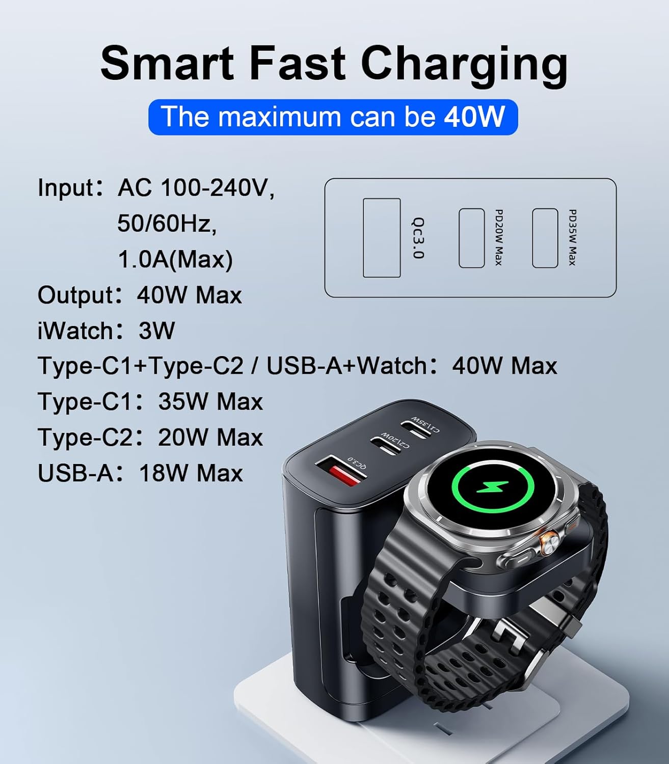 40W FAST CHARGING: For Galaxy Watch portable travel charging station is equipped with 【35W USB C port】【20W USB C port 】【18W USB A port】【3W Samsung Watch magnetic wireless charger】Charge your phone to 70% and your Galaxy Watch to 100% in less than 30 minutes, saving you hours of charging time.Warm tips: this product doesn't include cables.