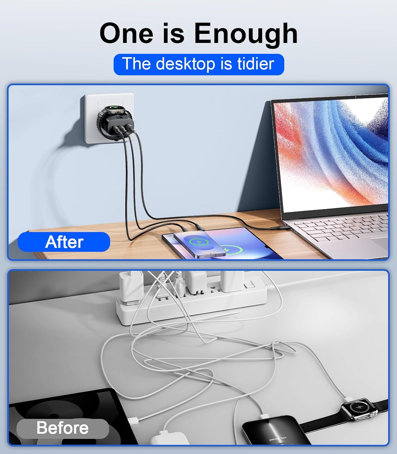 4-in-1 MULTI-PORT CHARGER: For Samsung watch charger fast charging block includes two USB-C ports, one USB-A port, and a 90° foldable Galaxy Watch wireless charger. You can easily charge up to four devices at once, saving space on your power strip, keeping your desk tidy, and perfect for on-the-go and traveling!