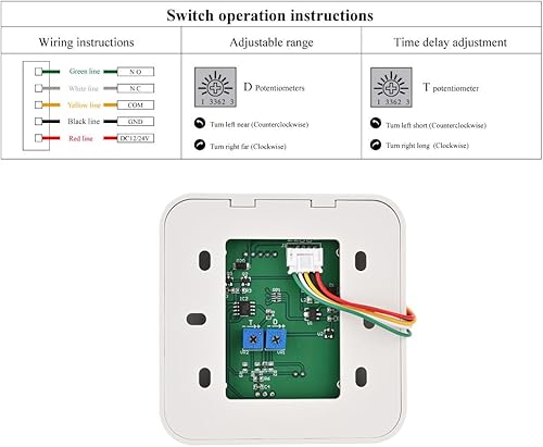 Adjustable Sensing Range: Features an adjustable sensing distance between 5 and 20cm; Time delay can also be adjustable between 0 and 30s.